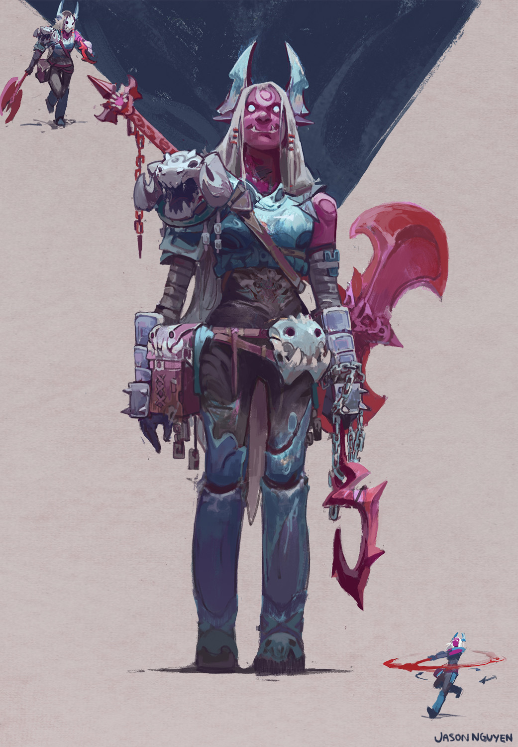 Son travail est en grande partie tourné vers du character design, c’est-à-dire qu’il va utiliser ses compétences pour donner vie à des personnages qu’il aura préalablement imaginés. Tout la difficulté est de rendre ces personnages intéressants au premier regard pour que le public interprète un univers et une histoire derrière eux. Jason Nguyen arrive à donner cette impression avec beaucoup de brio, ses créations sont crédibles et détaillées malgré un coup de pinceau qui peut paraître imprécis au départ.