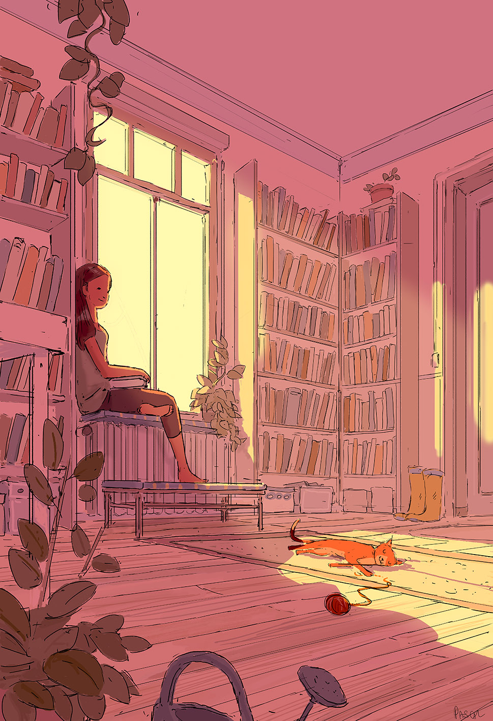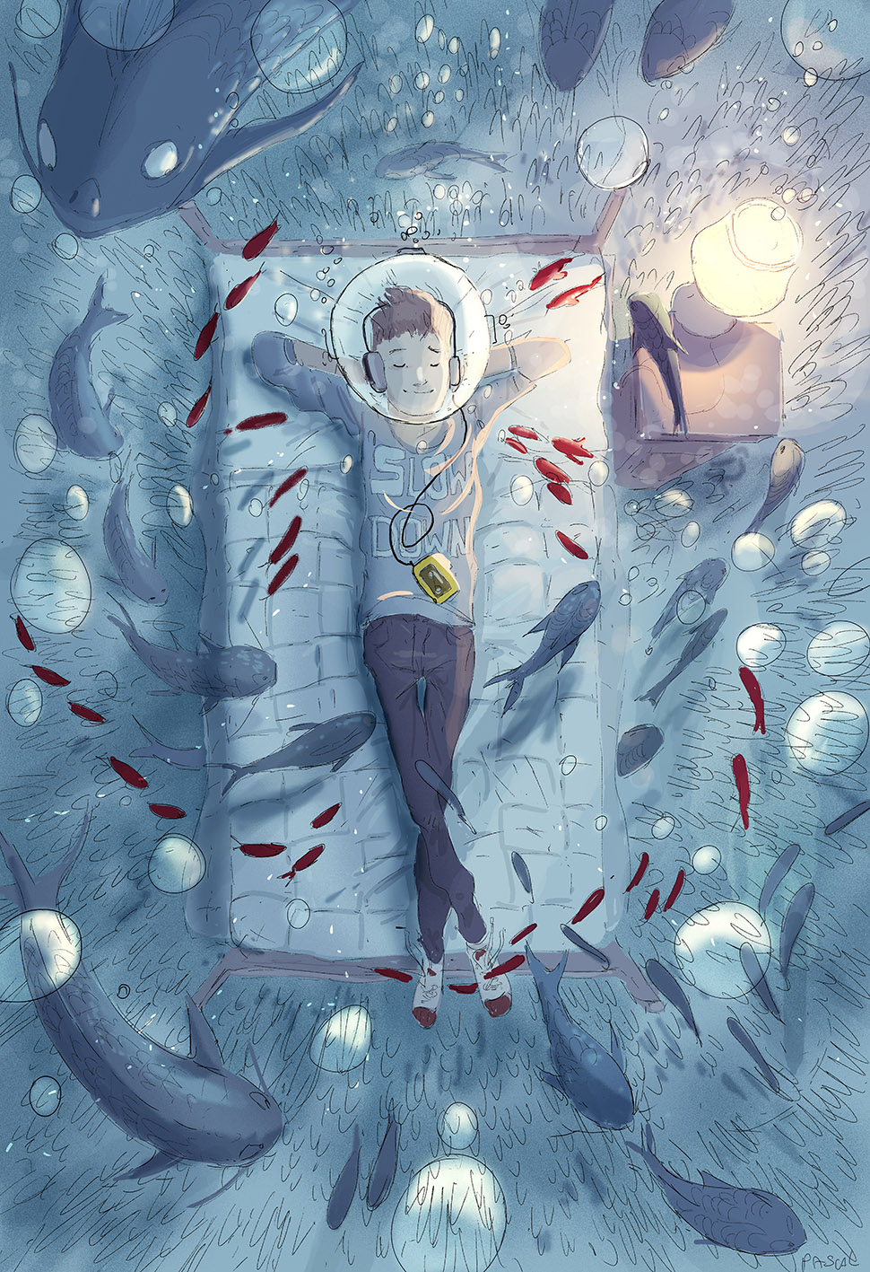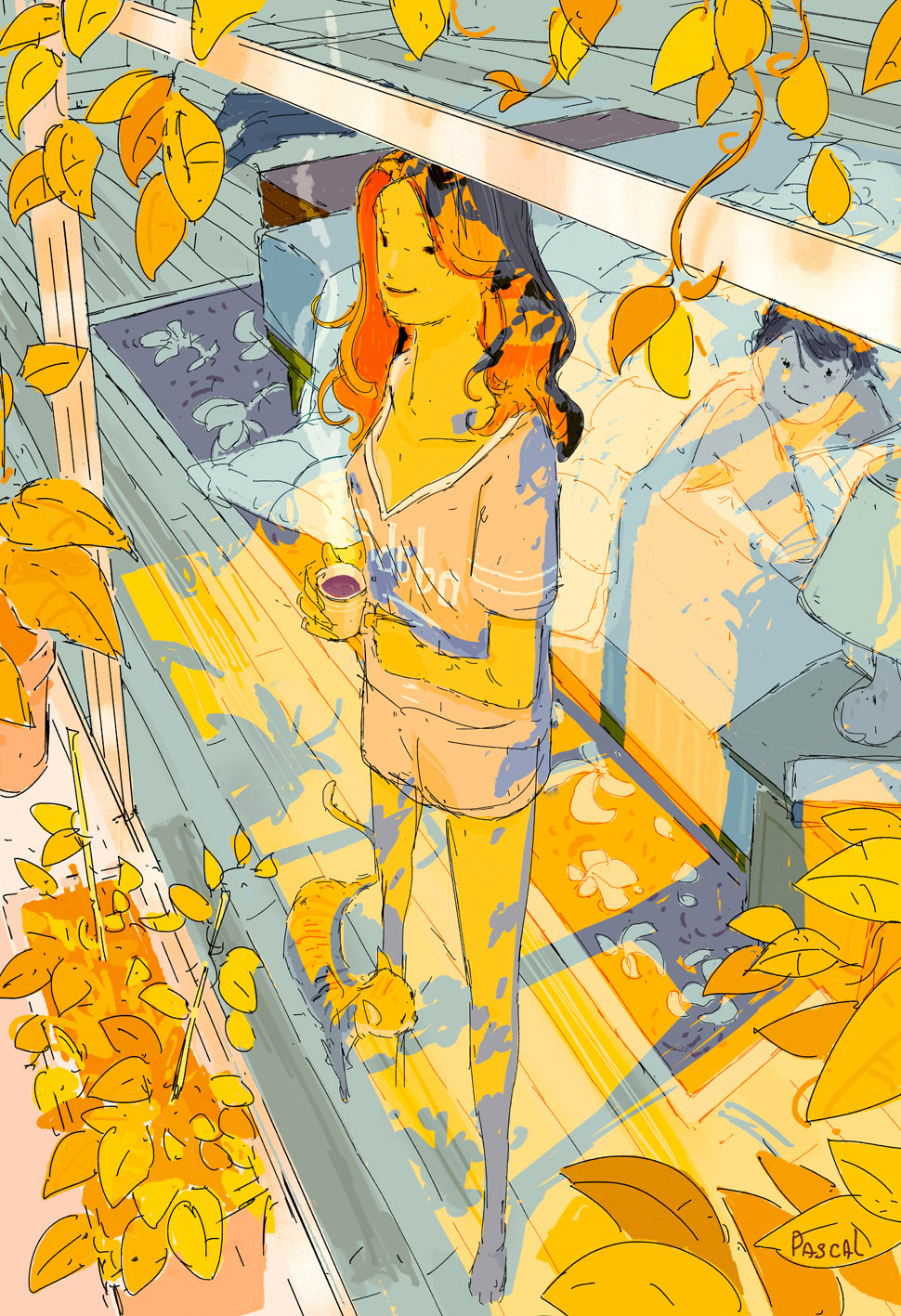 C’est donc une partie de son travail que j’ai sélectionné aujourd’hui pour vous, et que j’ai réduit à 25 illustrations par nécessité. Cependant, ça n’a pas été facile de choisir tant tout son travail est intéressant et significatif. Il le dit lui même, il dessine souvent à partir de ses propres expériences et des moments importants qu’il a pu vivre. Il illustre très souvent des joies simples, des satisfactions quasiment quotidiennes si on sait les voir : une grasse matinée en couple dans un lit baigné par le soleil, une boisson chaude sur sa terrasse par une soirée enneigée, une balade en forêt, une soirée entre amis au bord de la mer… Les exemples sont nombreux et Pascal Campion arrive à les retranscrire avec beaucoup de brio. Ses traits sont imprécis et rapides mais ses ambiances sont toujours pleines de vie et de chaleur, rendant le tout vraiment crédible aux yeux du spectateur.